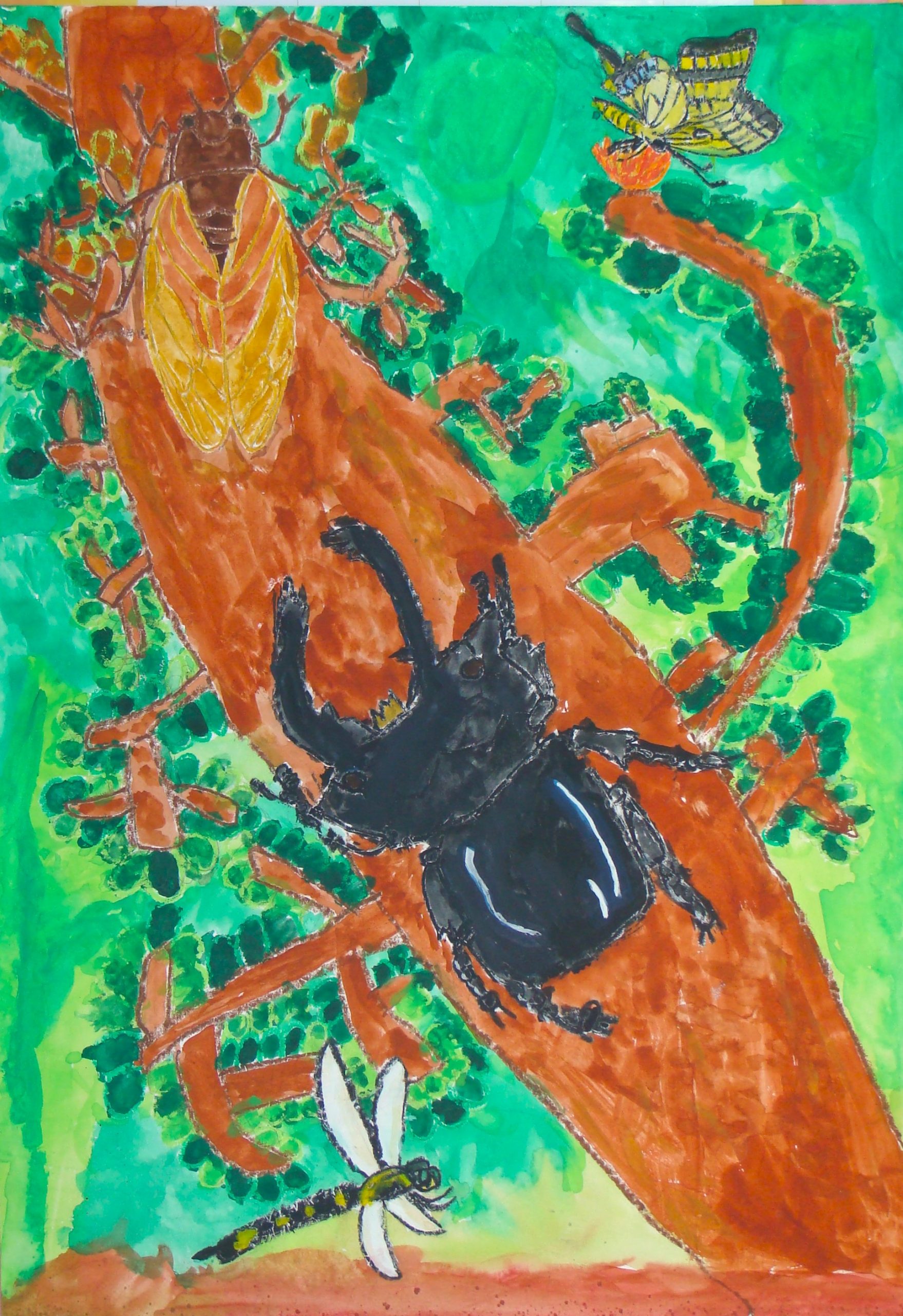 クワガタとセミとオニヤンマ、蝶など自分の好きな昆虫を一つの画面の中に収めて描いている。