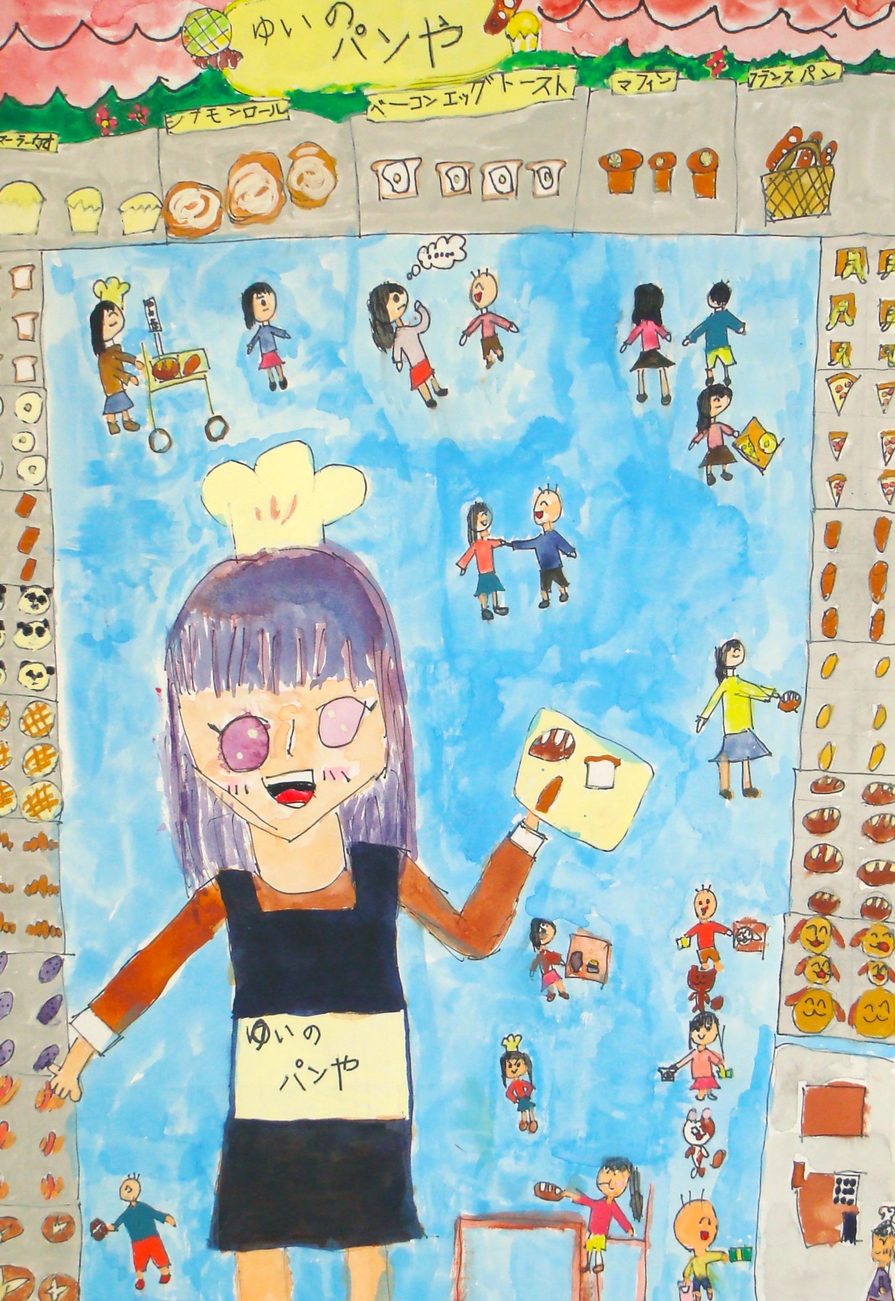 自分を大きく描いて、手に焼きあがったパンを持って、大勢のお客さんに売っている、夢のある絵になっている。