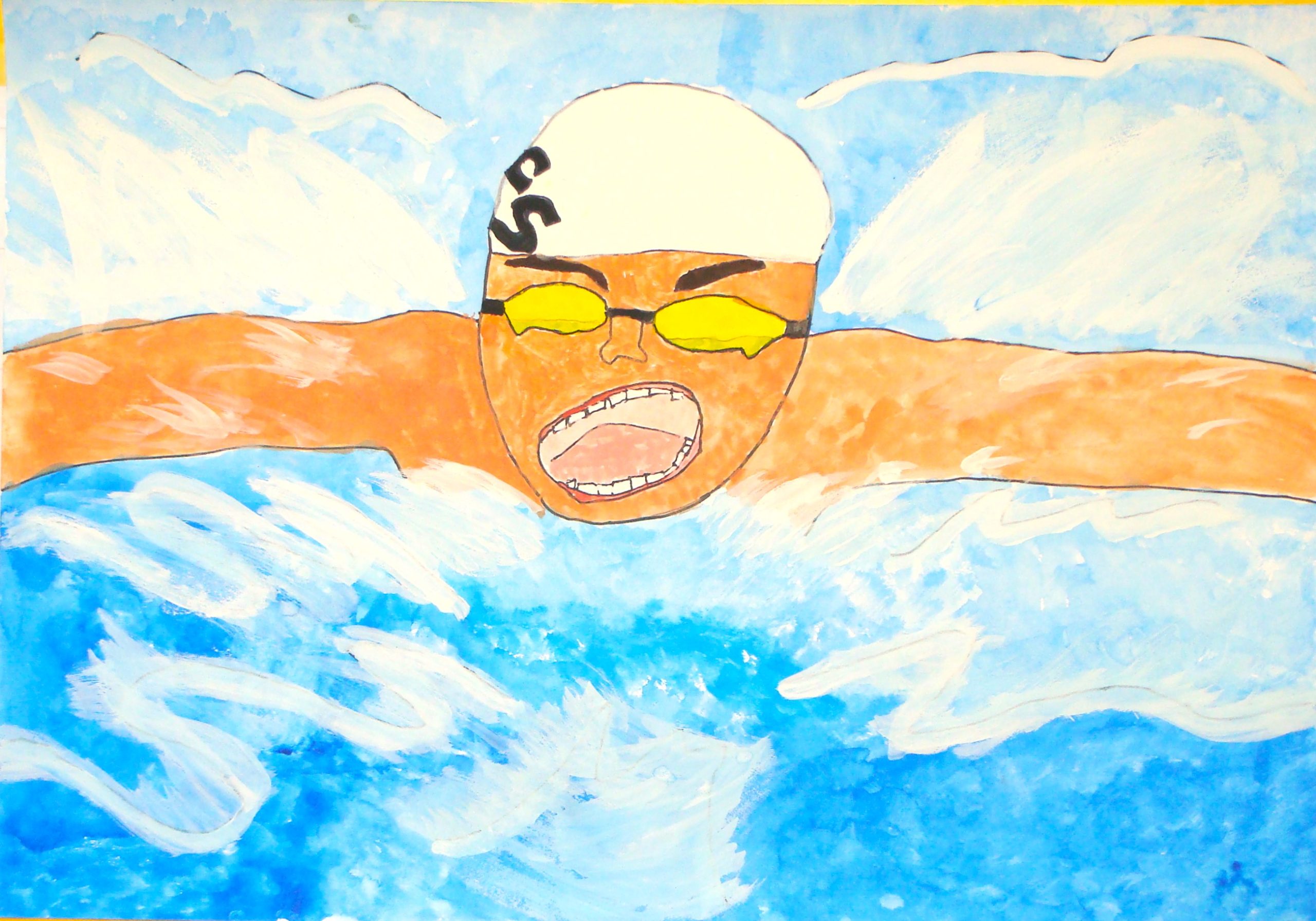 ぼくは水泳をならっていて、とくにバタフライをがんばっています。その様子を絵にあらわしました。