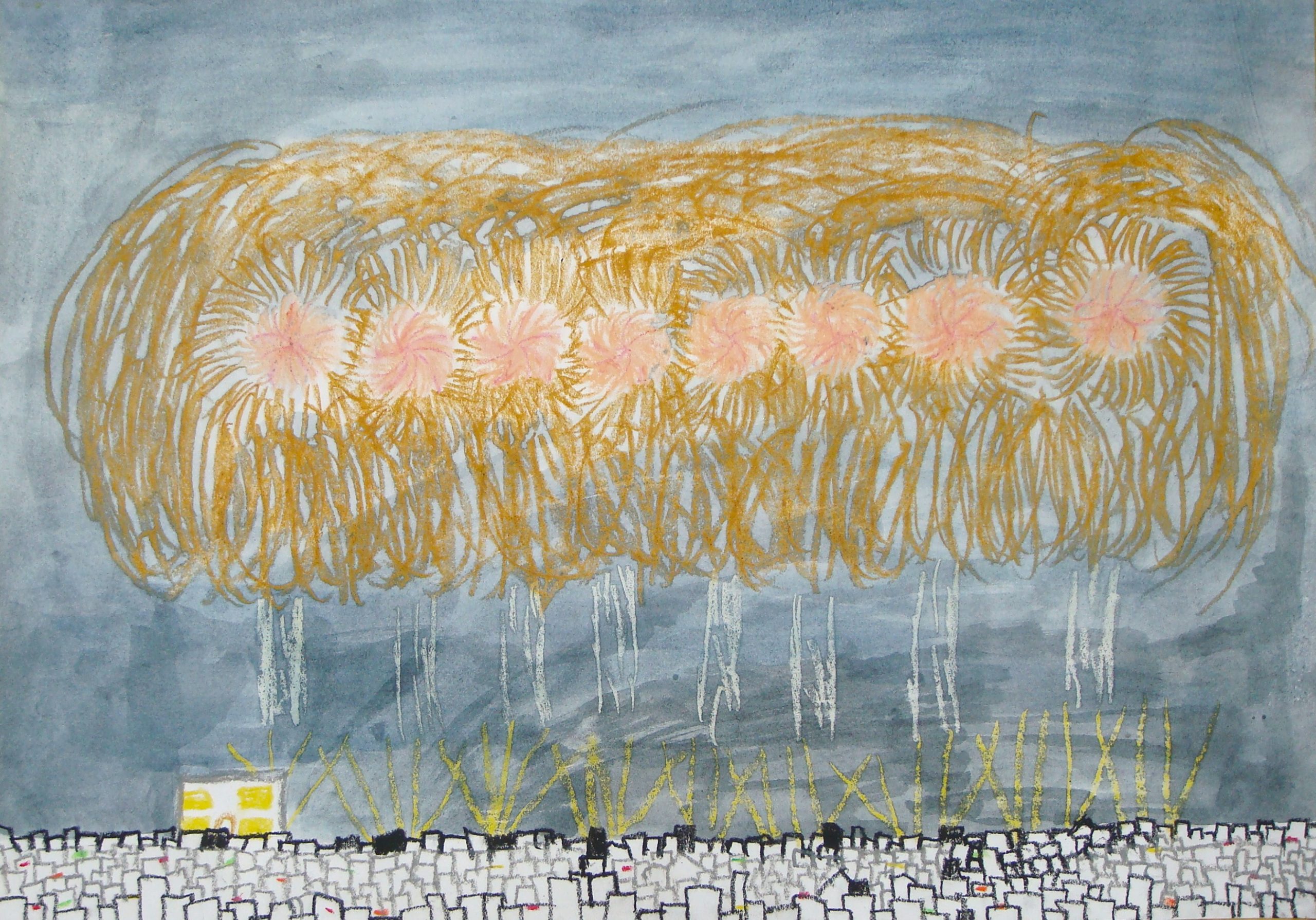 花火をかくのがむずかしかったです。屋上からのはく力がすごかったので、いい写真がとれたので全体的にかけました。