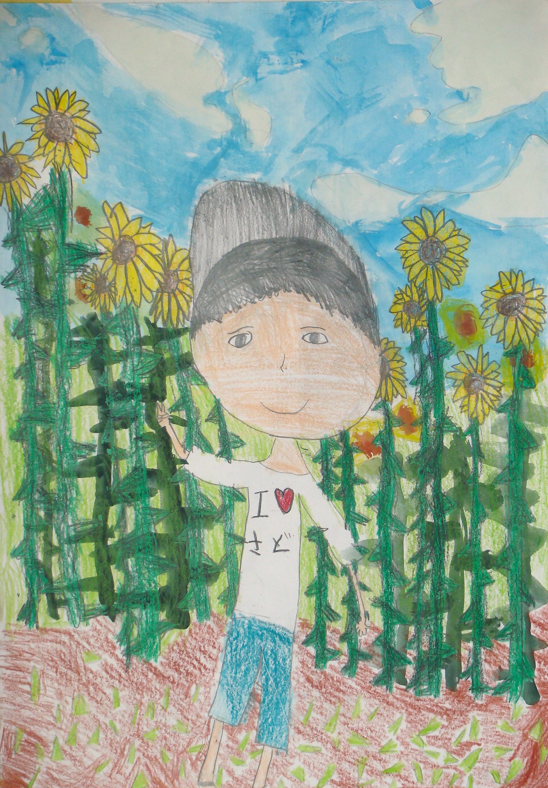 お気に入りのTシャツときれいなひまわりばたけをはじめて見たときのかんどうを絵にしました。