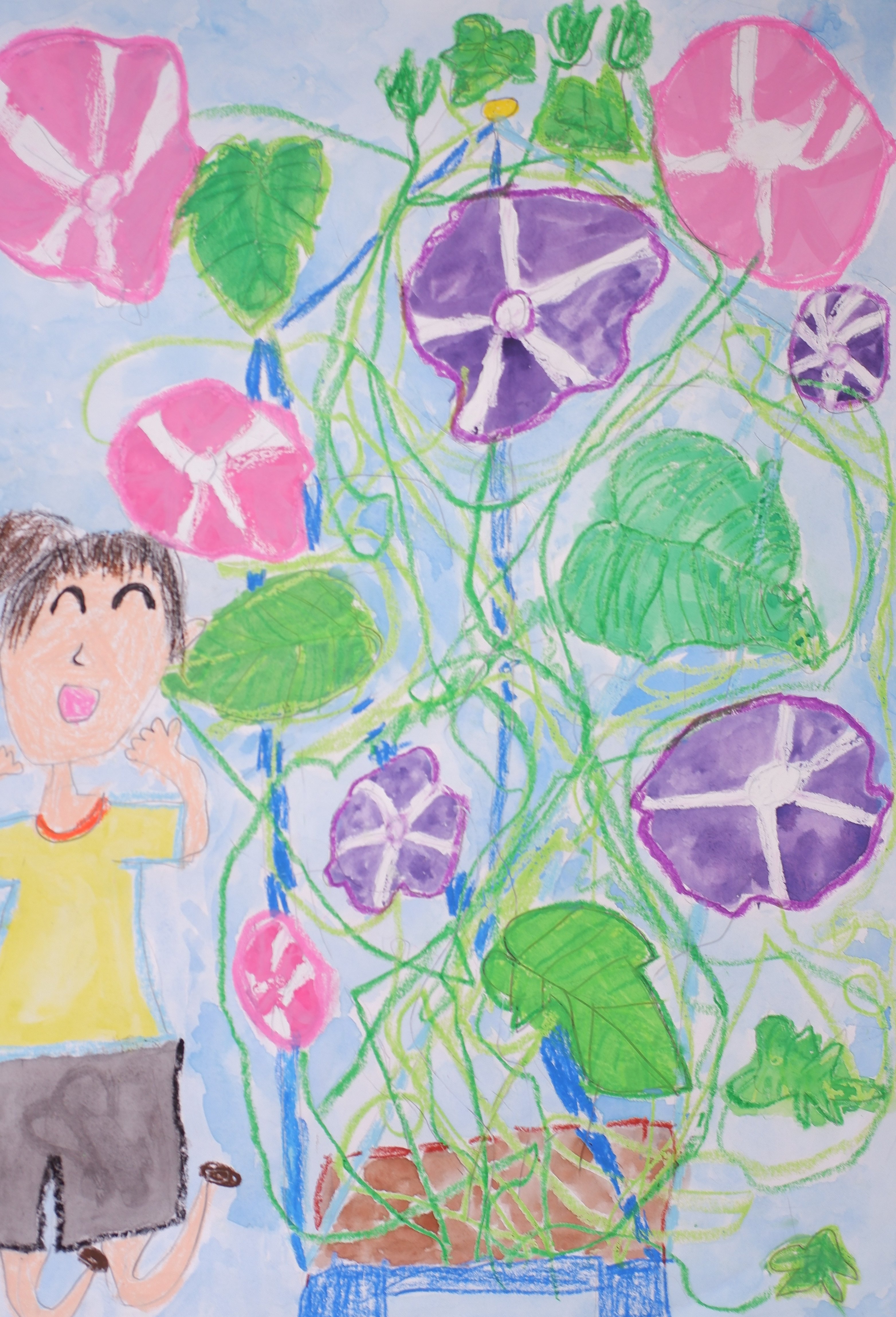 大事(だいじ)に育(そだ)ててきたアサガオがいっぱいに咲(さ)いて、とっても嬉(うれ)しく感(かん)じていることが表現(ひょうげん)されている、存在感(そんざいかん)のある絵です。「大事(だいじ)に育(そだ)ててきたという体験(たいけん)」があるからこそ、花や葉っぱ、ツルの様子(ようす)をリアルに表現(ひょうげん)できているのだと思います。花を大事(だいじ)に思い、喜(よろこ)んで関(かか)わる温かな世界(せかい)が描(えが)かれています。今後(こんご)も自然を愛する思いをつないでいってほしいと感(かん)じます。