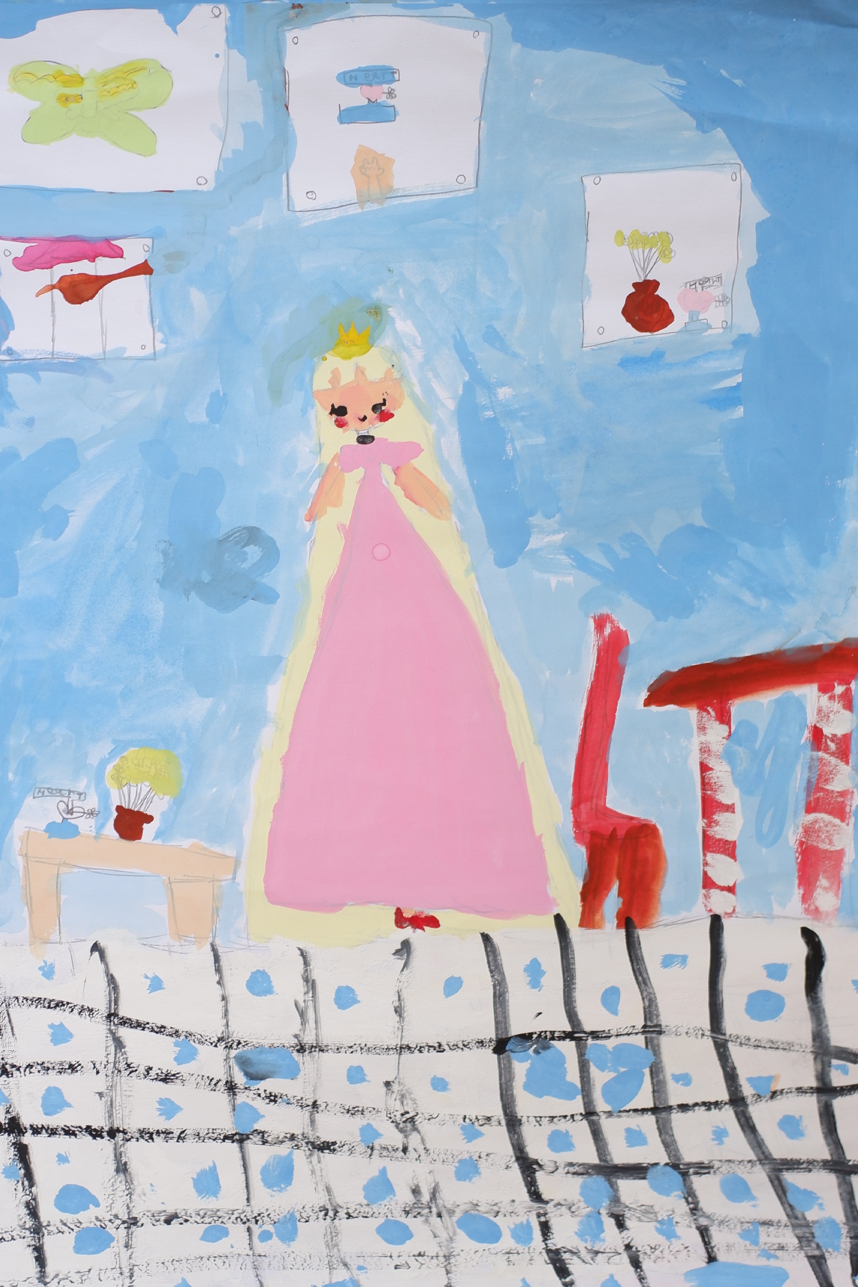 プリンセスが好きな物を壁に貼って、幸せな気持ちを表現しました。壁と床の模様を塗るところを頑張りました。