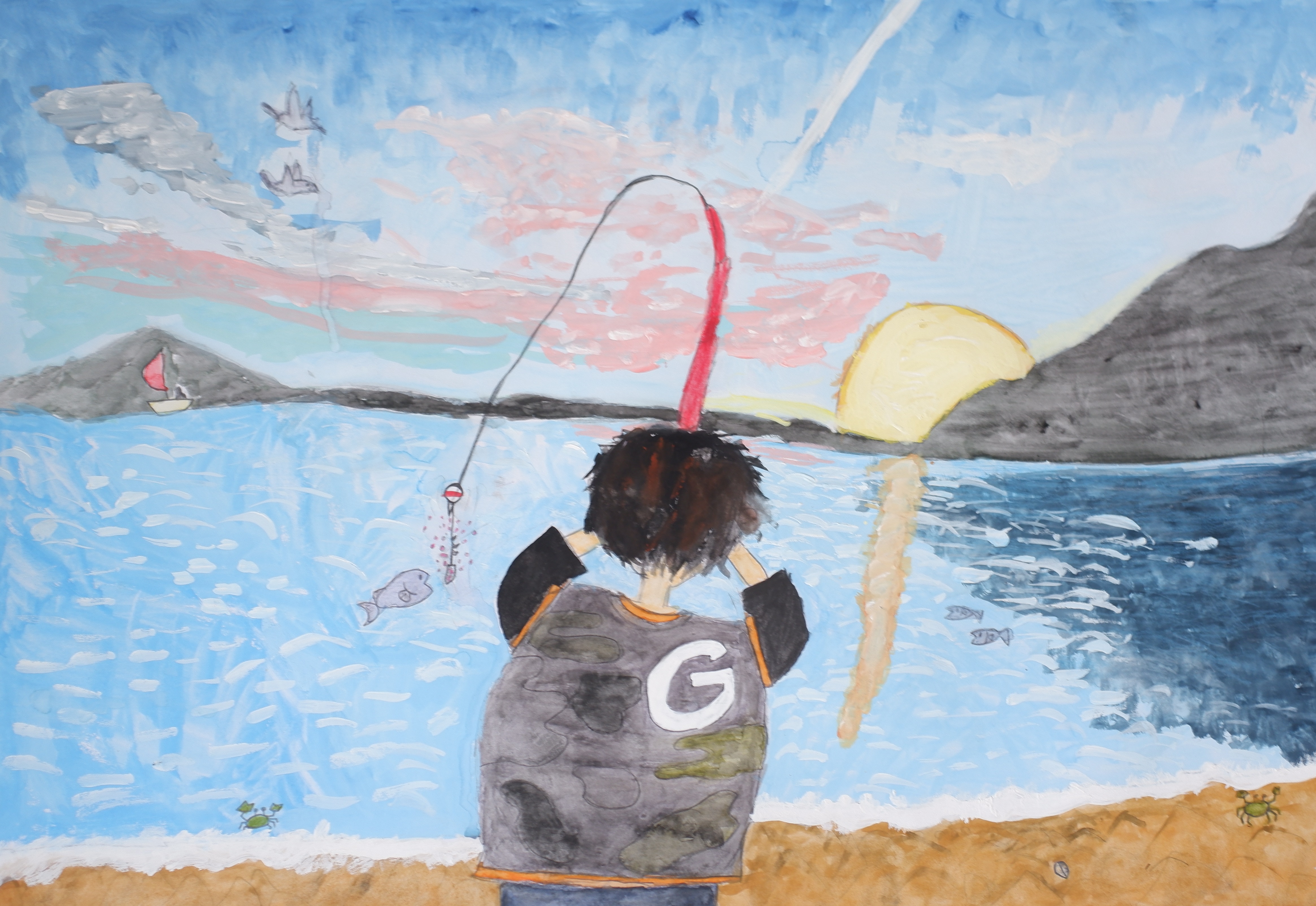 太陽が海からのぼる所の絵にしたかったので、海で朝、つりをしている自分を描きました。自分がつりをしている写真と朝日が海からのぼる写真を合体させて描くところを工夫しました。色ぬりがむずかしかったけれど、写真を見ながらがんばってぬりました。
