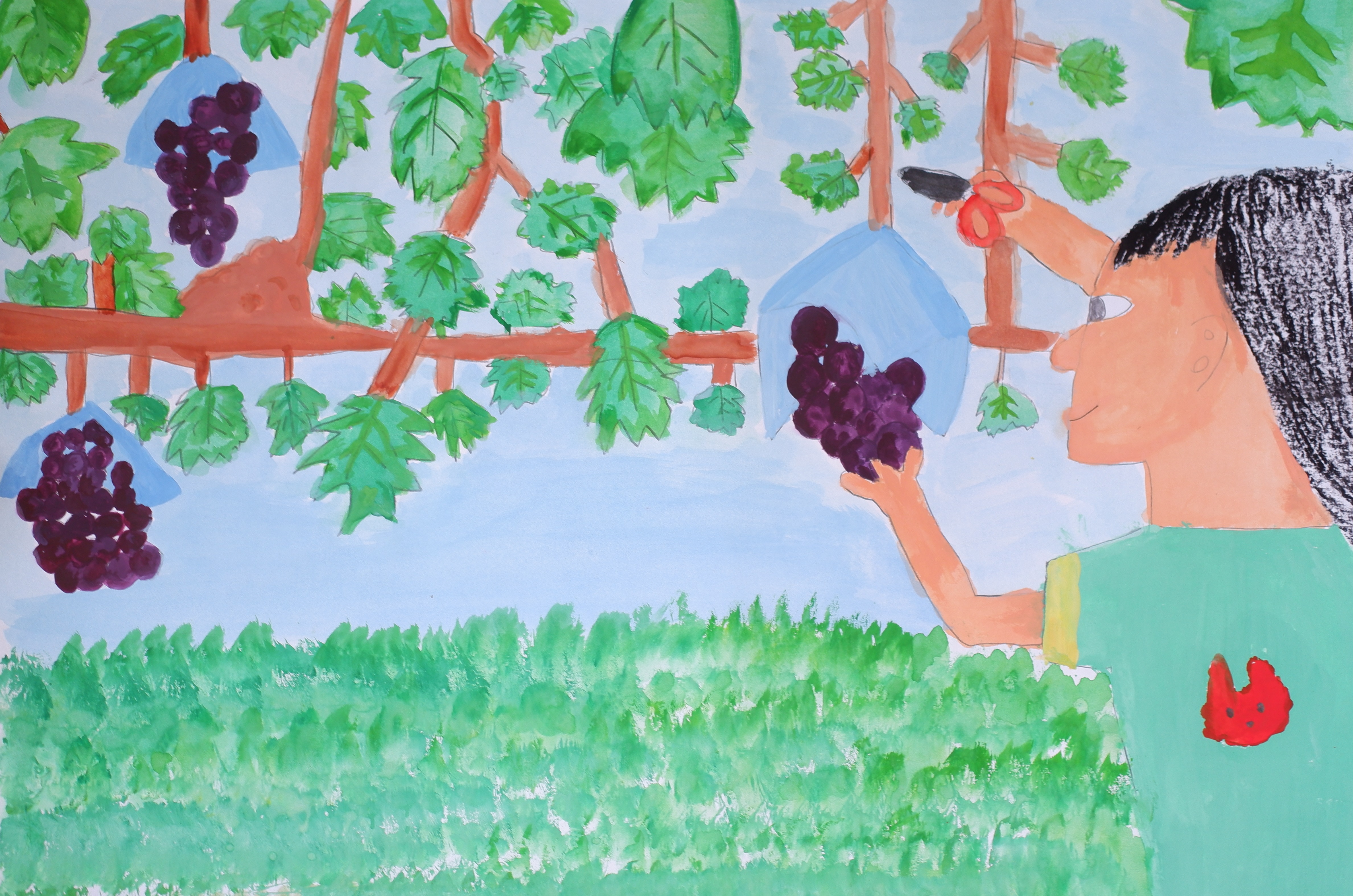 巨峰(きょほう)をとっているところでしょうか。大事(だいじ)に育(そだ)てられた、袋(ふくろ)のかかったブドウをはさみで収穫(しゅうかく)する。そういった緊張感(きんちょうかん)と喜(よろこ)びのようなものが画面(がめん)に表(あらわ)れています。ぶどうの枝(えだ)、それから1枚(まい)1枚(まい)の葉(は)、そういったものを丁寧(ていねい)に描(えが)いて、そのときの様子(ようす)がよくわかるように表(あらわ)しています。