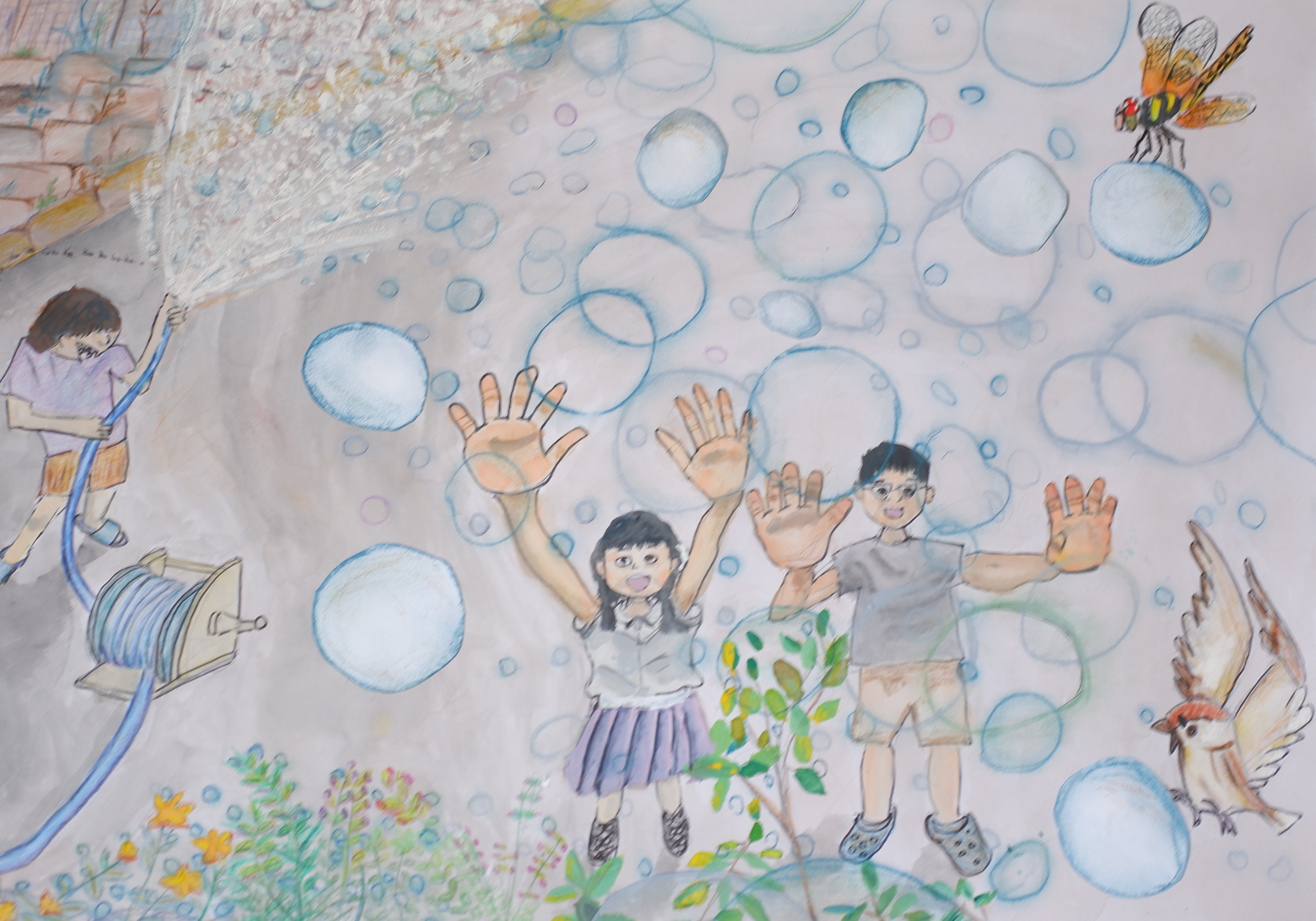 「水のトンネルつくって」「虹が見える」幼い頃から庭の散水が好きでした。長岡市は今年も酷暑、植物や生き物も一体となって涼を楽しめる水浴びは、最高のエンターテイメントだったのでしょう。自分の手をよく観察しながら手のしわを描き、絵の具の色も工夫していました。コンテを使って早く仕上げの水玉を描きたいと、細かい色塗りの過程も意欲的に進めていました。