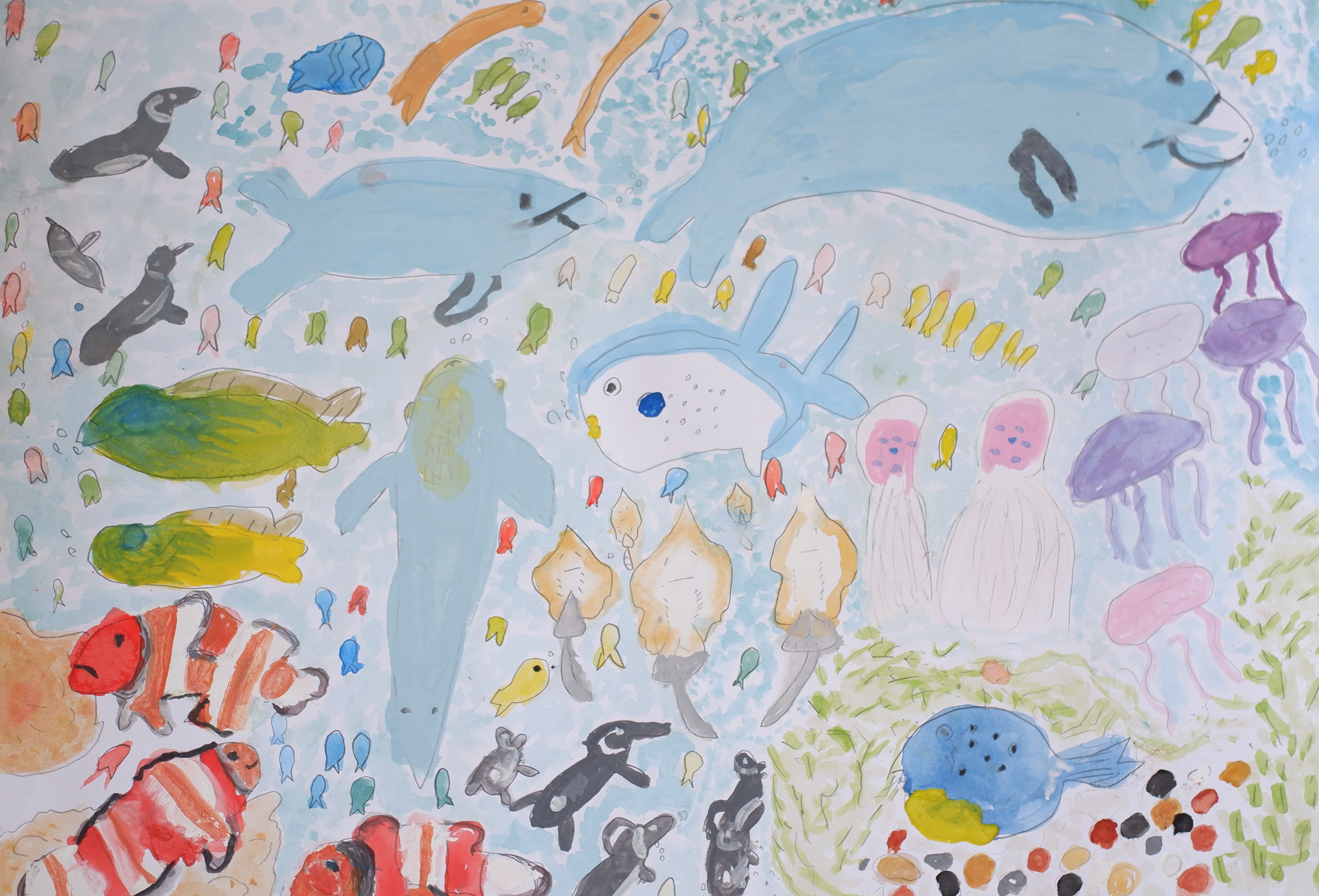 小さい魚をいっぱい描くのが大変でした。きょうかしょのスイミーみたいだなとおもいました。
