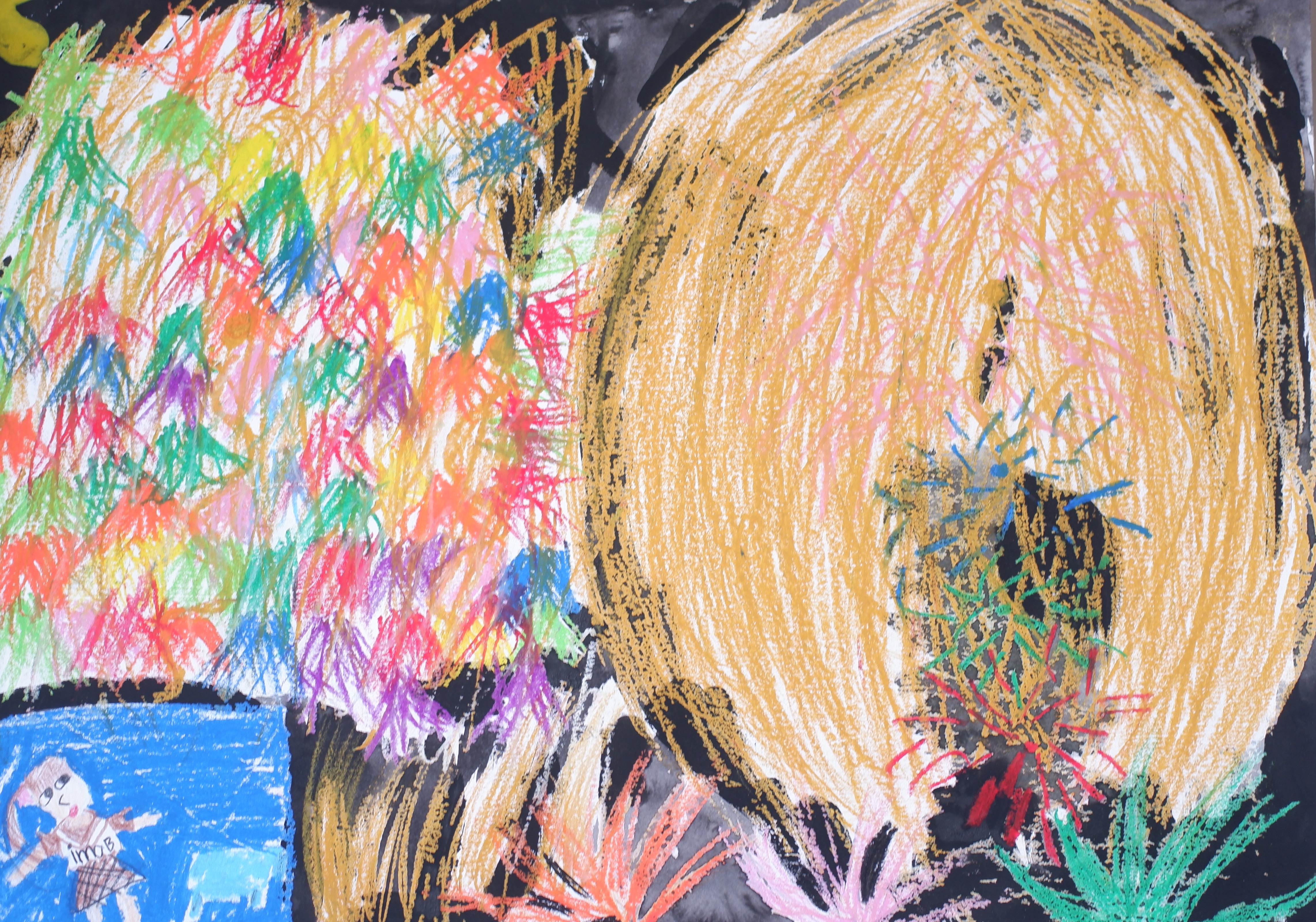 私が仕事中に、お家で一人で描いたようで、見られなかったのですが、すごく盛大に花火が表現されていて驚きました。下書きもせず頭の中で思い出しながら花火を描いたそうで、とても心に残る花火だったのだなぁと思いました。