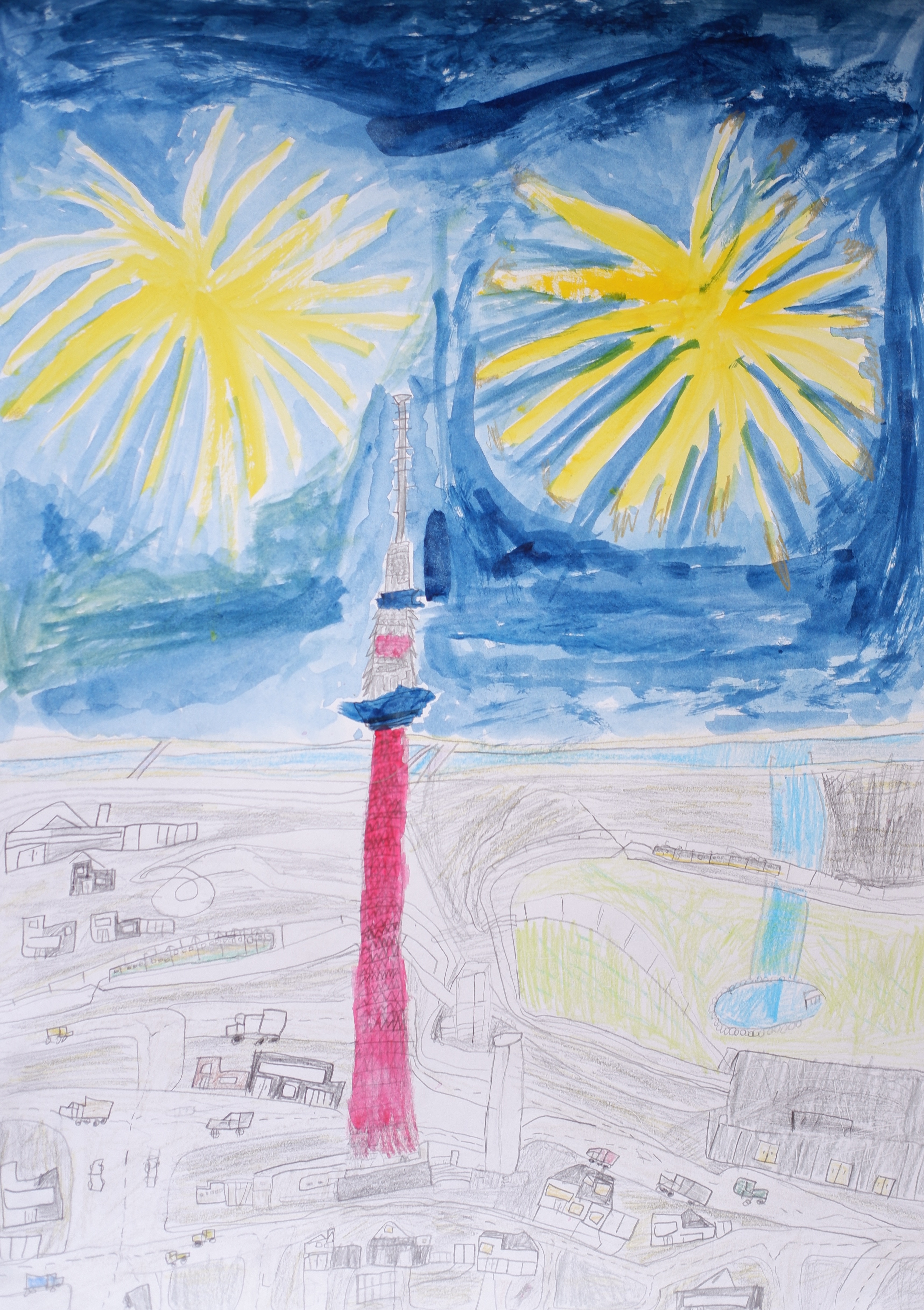 長岡(ながおか)花火(はなび)を家族(かぞく)で見に行ったその様子(ようす)と、それから東京(とうきょう)に旅行(りょこう)に行ってスカイツリーを見た様子(ようす)、この2つを組(く)み合(あ)わせて作者(さくしゃ)が描(えが)いた想像(そうぞう)の絵(え)ということになります。こんな風(ふう)景(けい)があったらいいなという思いもよく表(あらわ)れています。特(とく)に、すっと高くそびえるスカイツリーの様子(ようす)と、その下の少し薄暗(うすぐら)い中に建物(たてもの)や道路、乗り物など都会(とかい)の様子(ようす)が細(こま)かく描(えが)かれています。