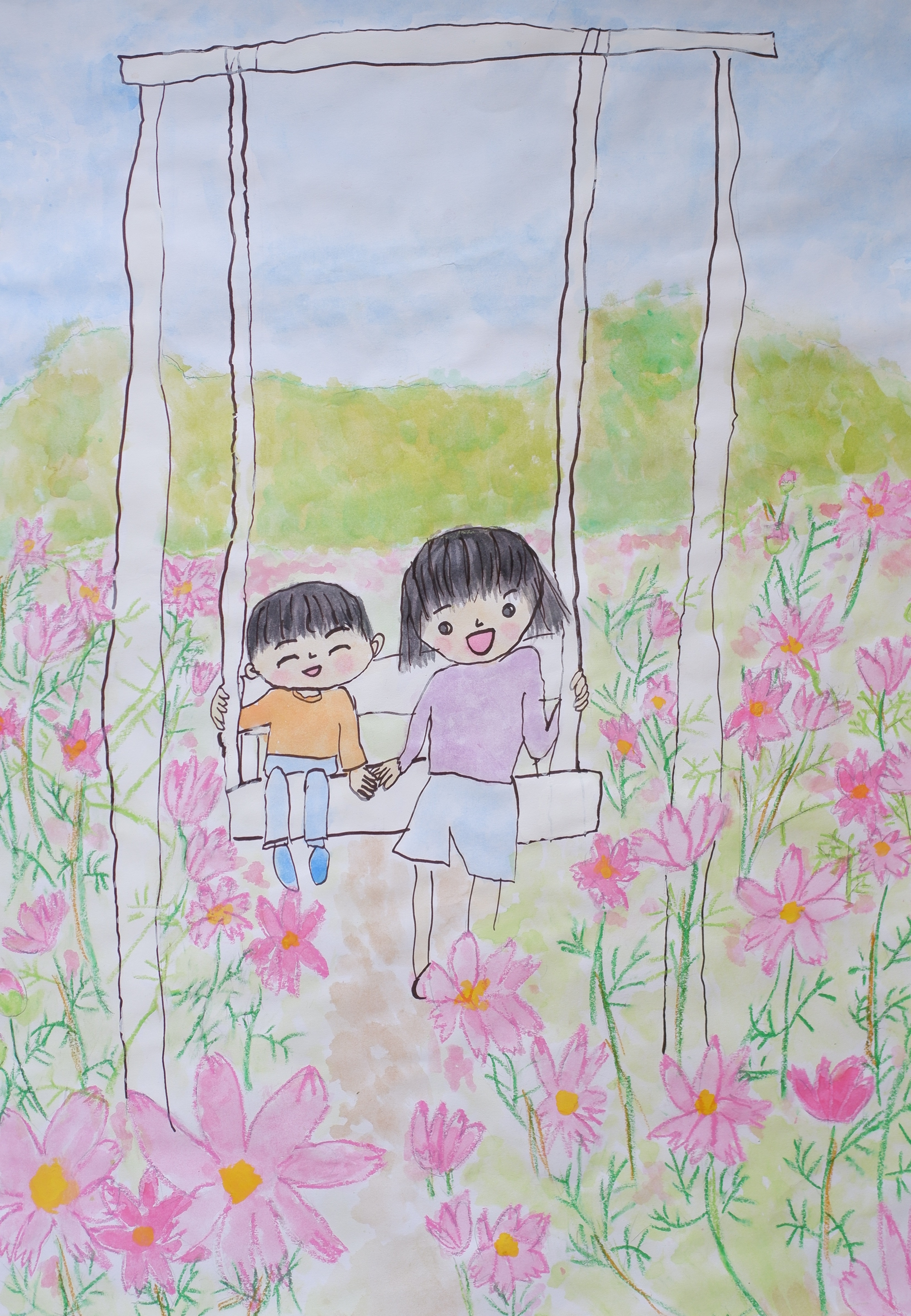 絵本(えほん)の挿(さ)し絵(え)のような美(うつく)しい作品(さくひん)です。木々の緑(みどり)、空の青(あお)、その中に美(うつく)しいコスモスの色彩(しきさい)が対比(たいひ)していて、吸(す)い込(こ)まれそうな思いになります。美(うつく)しい画面(がめん)の中央(ちゅうおう)にブランコがあり、そこに姉弟が存在(そんざい)している、その表情の温(あたた)かさが広がっています。家庭(かてい)の温(あたた)かい絆(きずな)があって、その楽しさを表現(ひょうげん)しようとする意欲があって、それらが結集(けっしゅう)して実現した豊かな作品(さくひん)です。