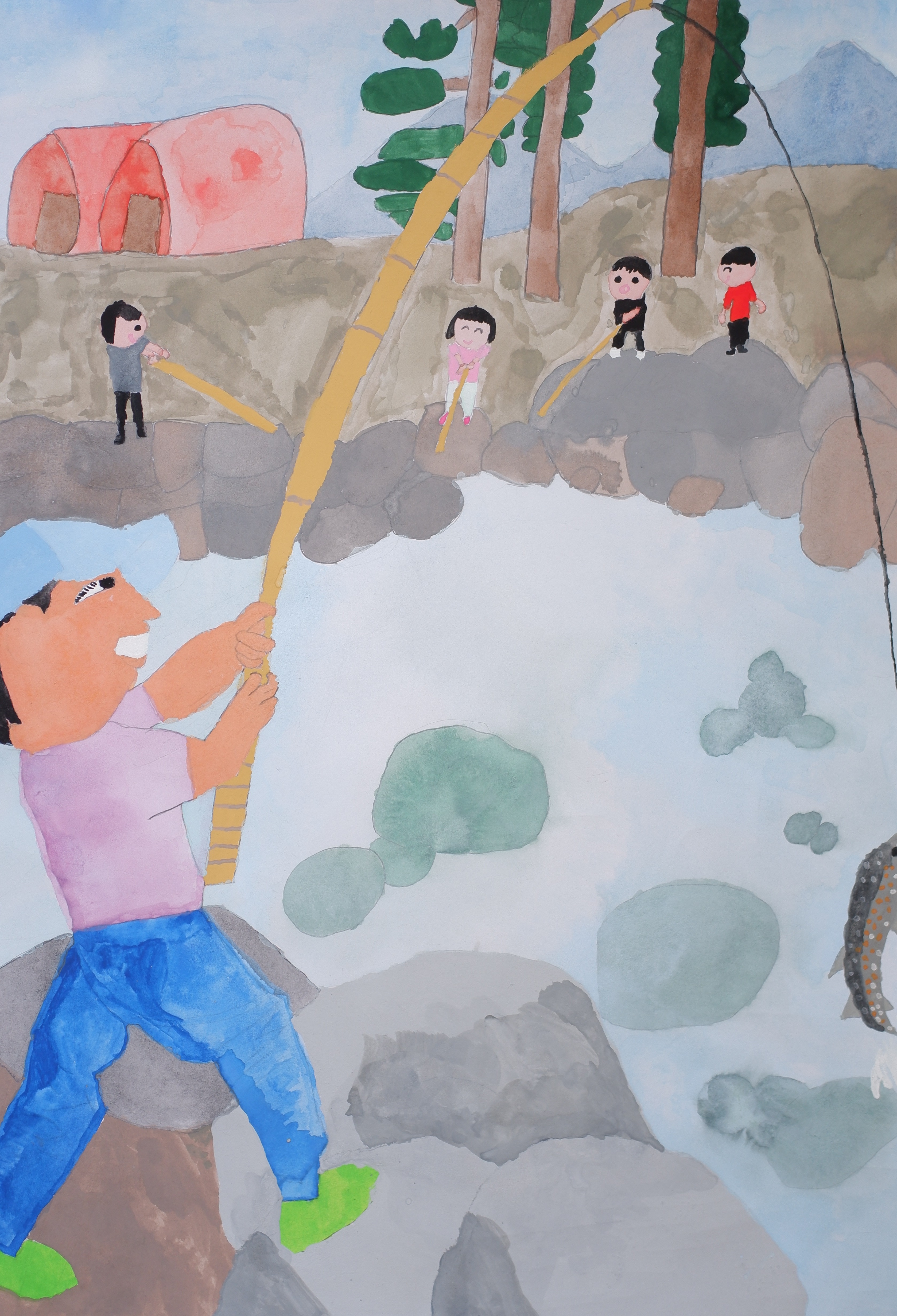 わたしは、初めてイワナをつりました。イワナがエサのぶどう虫にかかるとさおがしなって重くなるので、さおをしっかりにぎって足に力を入れてつり上げたときの様子が伝わるように工夫してかきました。がんばったところは、川がすき通って見えるように色をまぜてぬったところです。一生けんめいつったイワナもていねいにぬったので見てほしいです。かんせいしてうれしかったです。