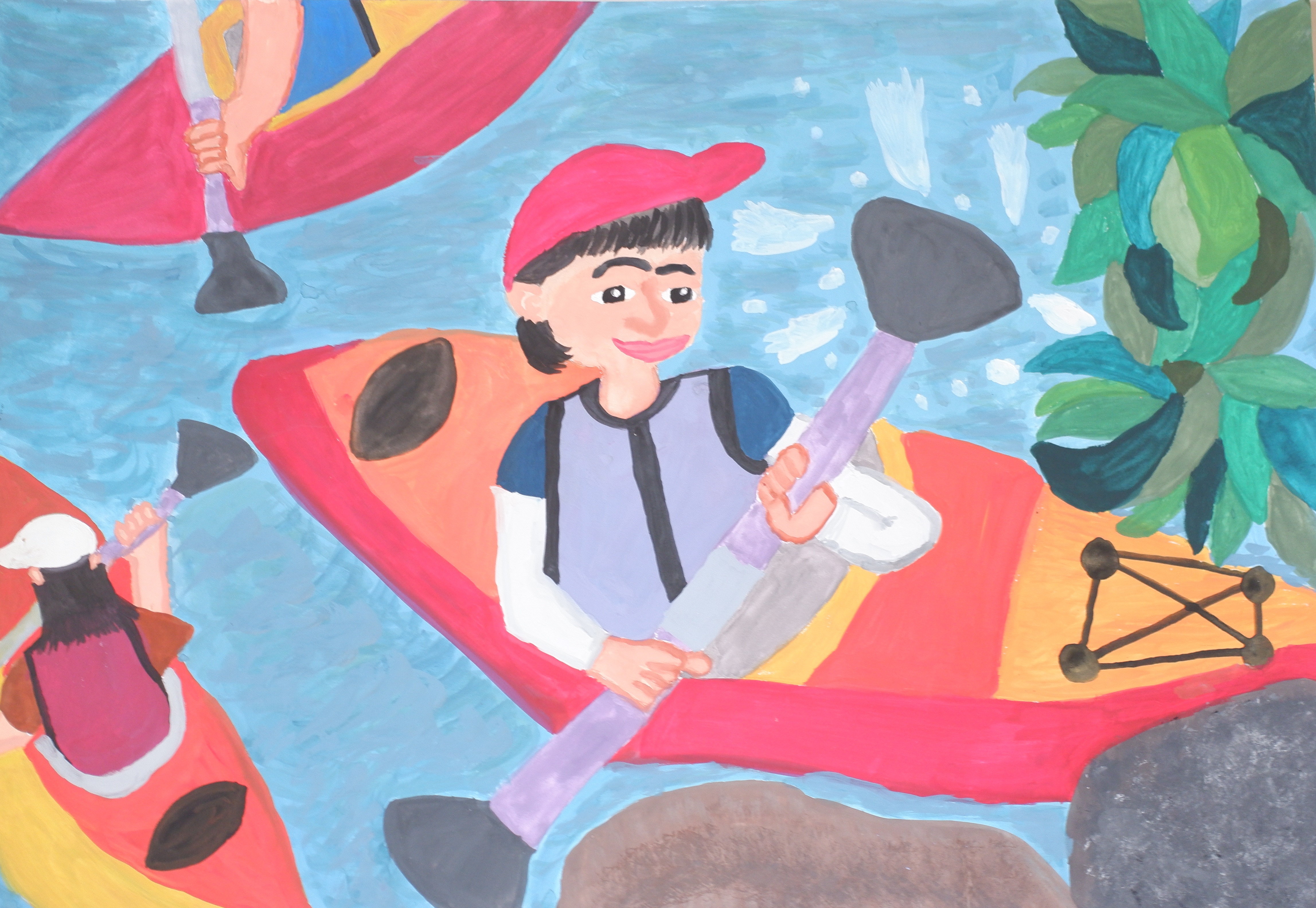 カヌーをこぐ動きを丁寧に描きました。色塗りでは、水の流れや、葉っぱ一枚一枚を工夫して塗りました。