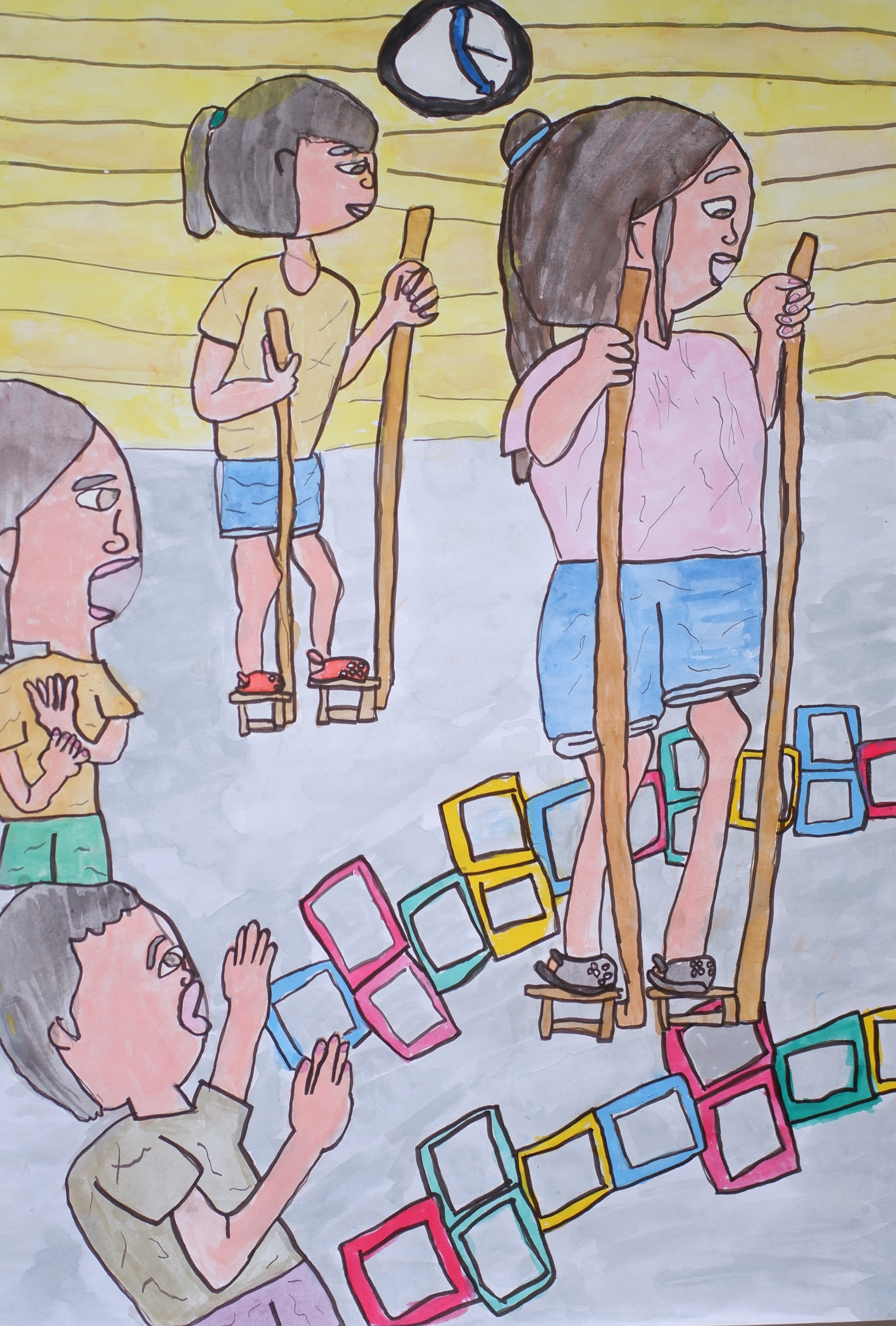 「竹馬(たけうま)に乗(の)れたよ!」という感動(かんどう)が画面(がめん)いっぱいに表現(ひょうげん)されています。乗(の)れて嬉(うれ)しかったという私、それを応援(おうえん)する両親(りょうしん)の姿(すがた)に、家族(かぞく)の温(あたた)かさが滲(にじ)み出ています。絵の具で丁寧に色づくりをし、画面全体に美しいハーモニー(調和)が広がっている作品です。