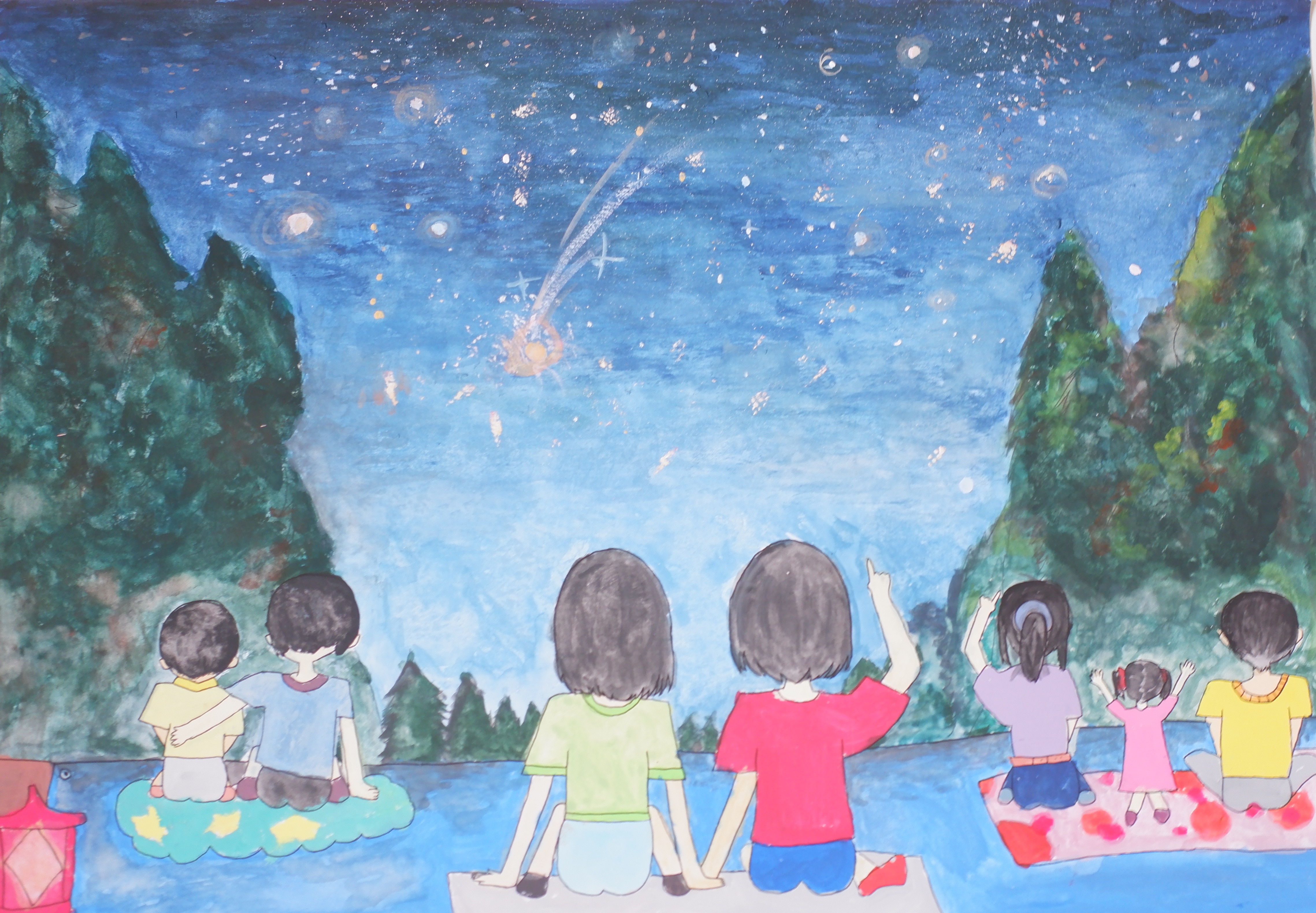 夏休みに友達と見にいきました。人工衛星やさそり座、流れ星などがとてもきれいに見えたのでこの絵をかきました。頑張ったところは夜空の色と星です。夜空の空は、色々な色を使ってなじませるように塗りました。星はどうやったらきれいに見えるか考えながら、見た星もいろんな色で輝いていたので思い出しながらかきました。