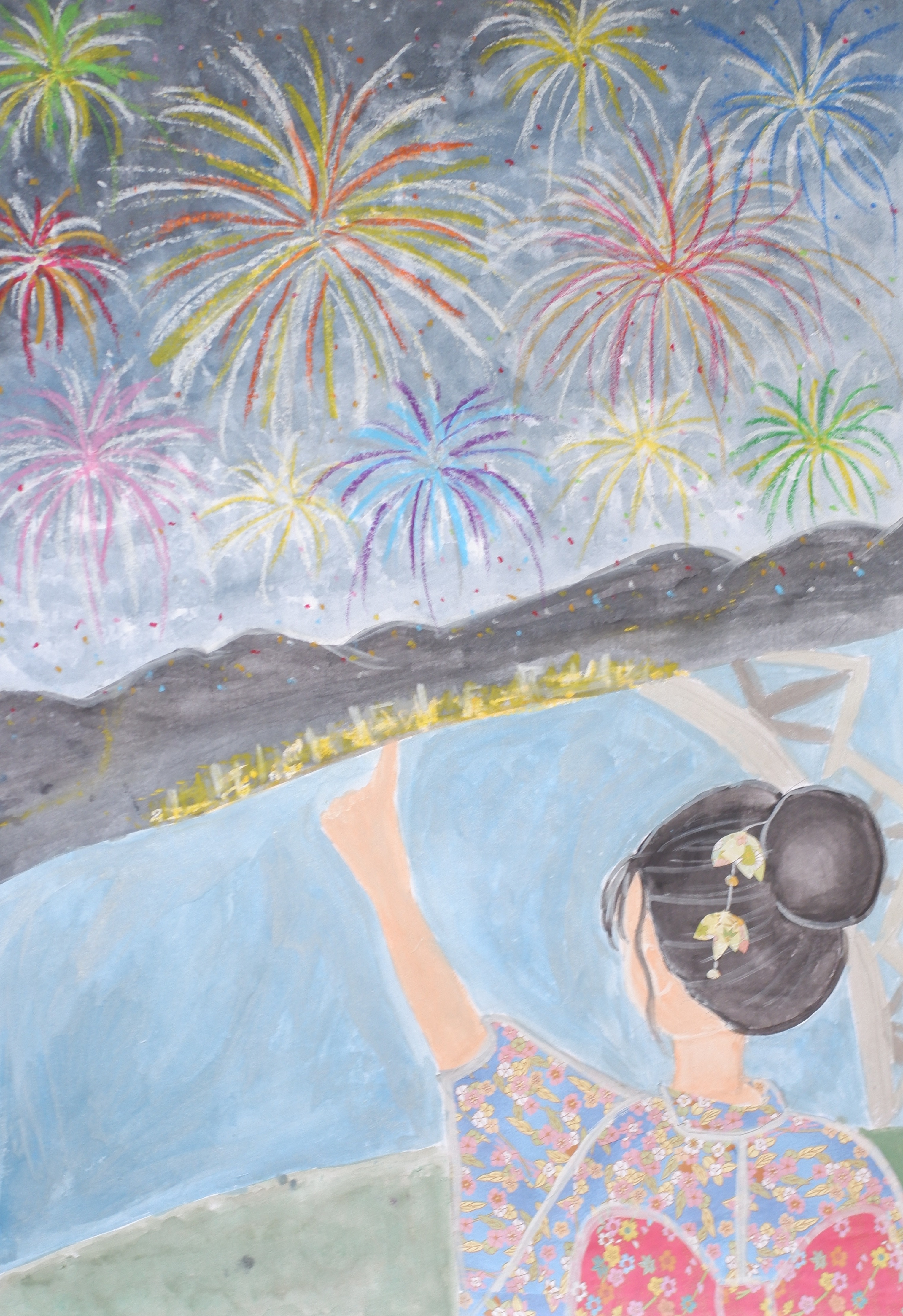 丁寧に折り紙を切って貼り、花火はクレヨンを使って上手に描いていた。