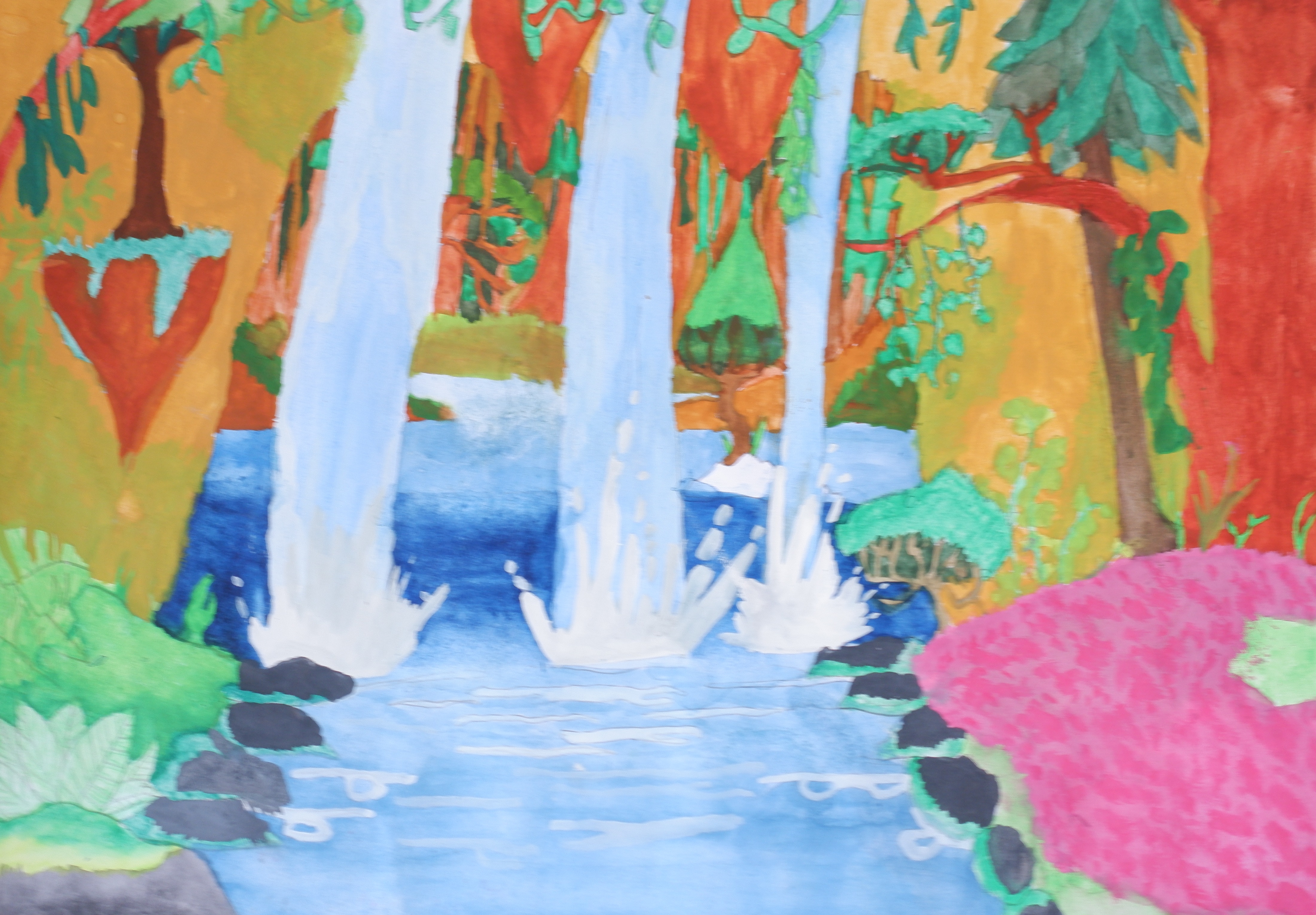 花のところに点を入れてたくさんの花が咲いているように工夫しました。特に見てほしいところは、滝の裏側の水面の濃さです。