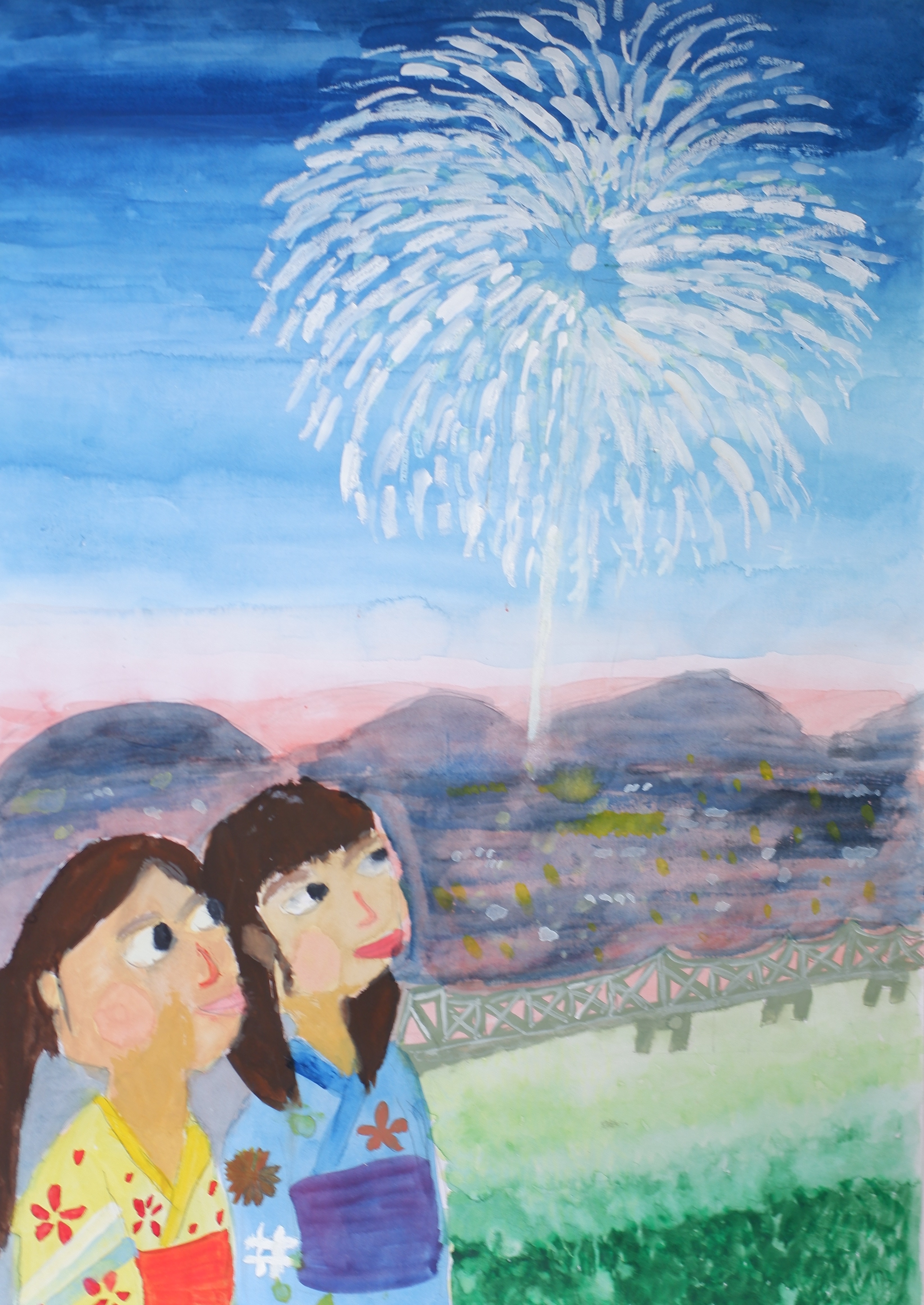 作者(さくしゃ)の深(ふか)い思いが感(かん)じられる作品(さくひん)です。長岡(ながおか)花火(はなび)・白菊(しらぎく)について事前(じぜん)に理解(りかい)を深(ふか)めて、それを見ている自分(じぶん)たちの思いを込(こ)めて表現(ひょうげん)しています。絵具を丁寧に重ねて彩色し、花火(はなび)の美(うつく)しさ、夕焼(ゆうやけ)の美(うつく)しさが広がっています。そして、それを見る自分(じぶん)たちの服装(ふくそう)、表情(ひょうじょう)、視線(しせん)など、画面(がめん)の各所から誠実(せいじつ)な気(き)持(も)ちが感(かん)じられます。