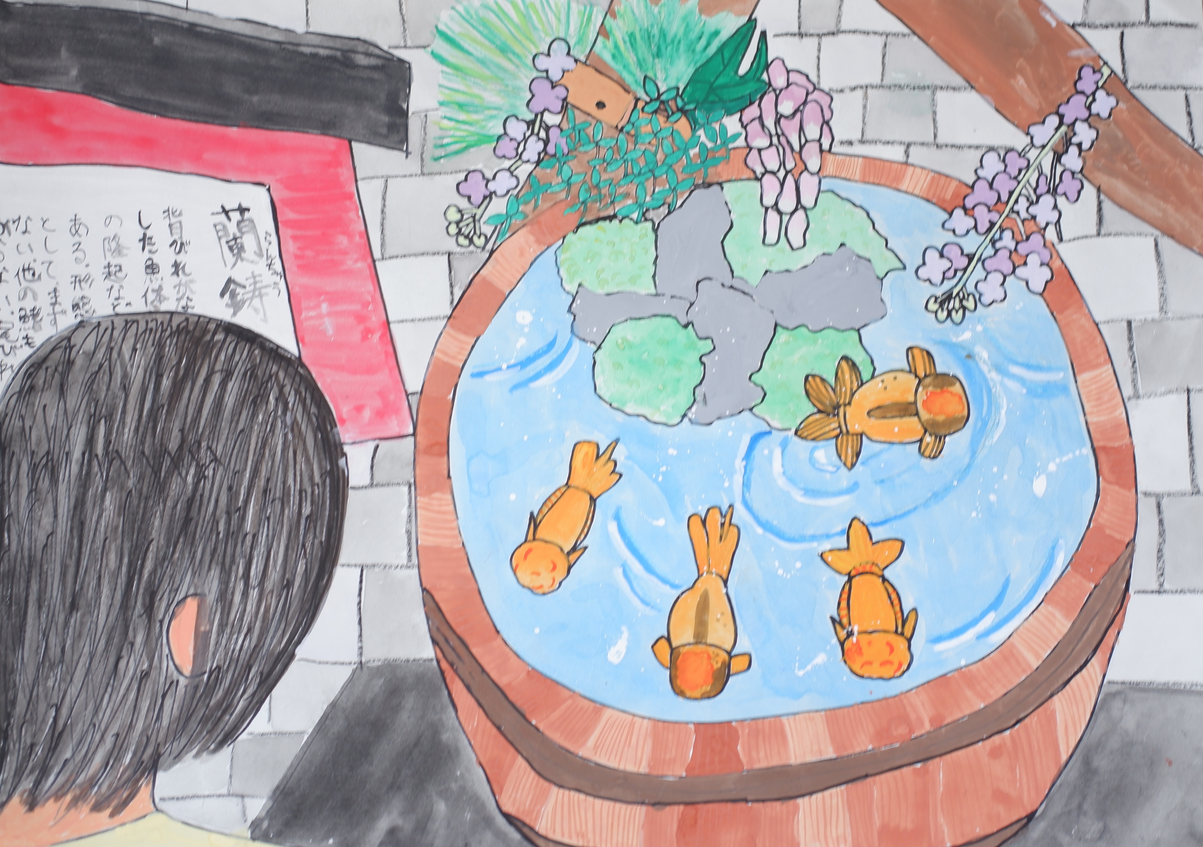 私はこの夏、アクアリウムを見に行きました。その中でも見たことのない不思議な形の金魚に心を打たれたので絵にしてみました。工夫したところは、金魚の尾びれです。1匹1匹違う尾びれにし、美しさを表現しました。色を変えてヒレの線を描いたことで、より金魚らしくなりました。他にも、藤の花の色を変えたり、金魚鉢を3色使って縦に塗ったりと細かいところをがんばりました。特に見てほしいところは水です。水色と白の絵の具と青いクレヨンを使い、泡や流れを表現しました。気持ちよく優雅に泳ぐ金魚が描けました。