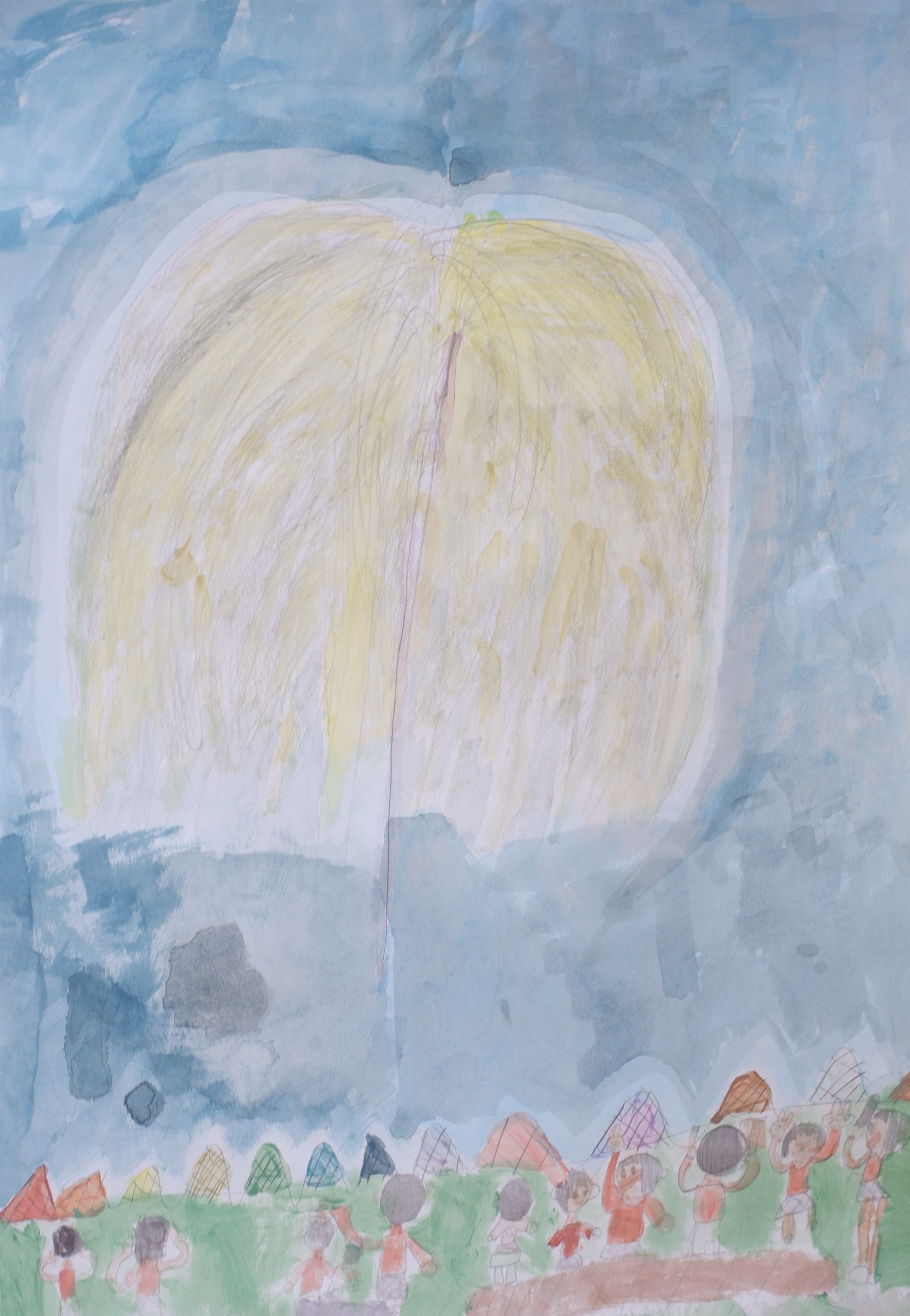 かぞくでみにいったながおかはなびをかきました。かんがえながらはなびのいろをえらびました。いろんないろをつかってぬったり、なんにちもかけてがんばりました。