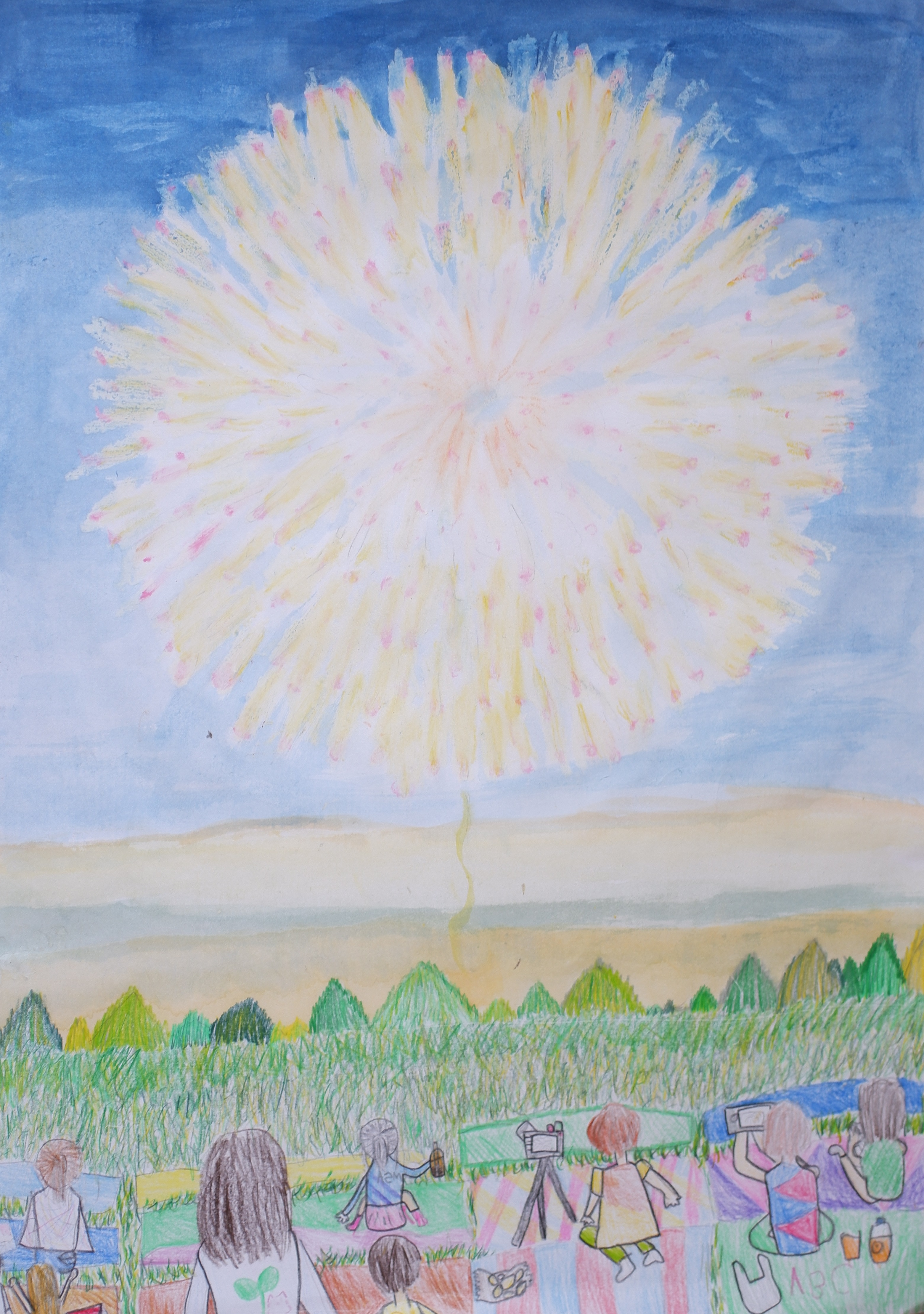 暗くなる前に上がった花火、白菊をかきました。工夫したところは花火が目立つように大きくかいたこと、夕やけもかきました。長岡の人とたくさんのちがう県の人も見に来てくれているんだなぁと思って嬉しかったので、見ている人たちの様子もかきました。学校で花火に色々な平和への願いや亡くなった人への思いなとたくさんの気持ちが込められていることを習いました。おもいを伝える花火だと思ったので、ひとつの花火にたくさん集まっているおもいを表現できるように、ていねいにひとつひとつの光に思いをつめるようにかきました。