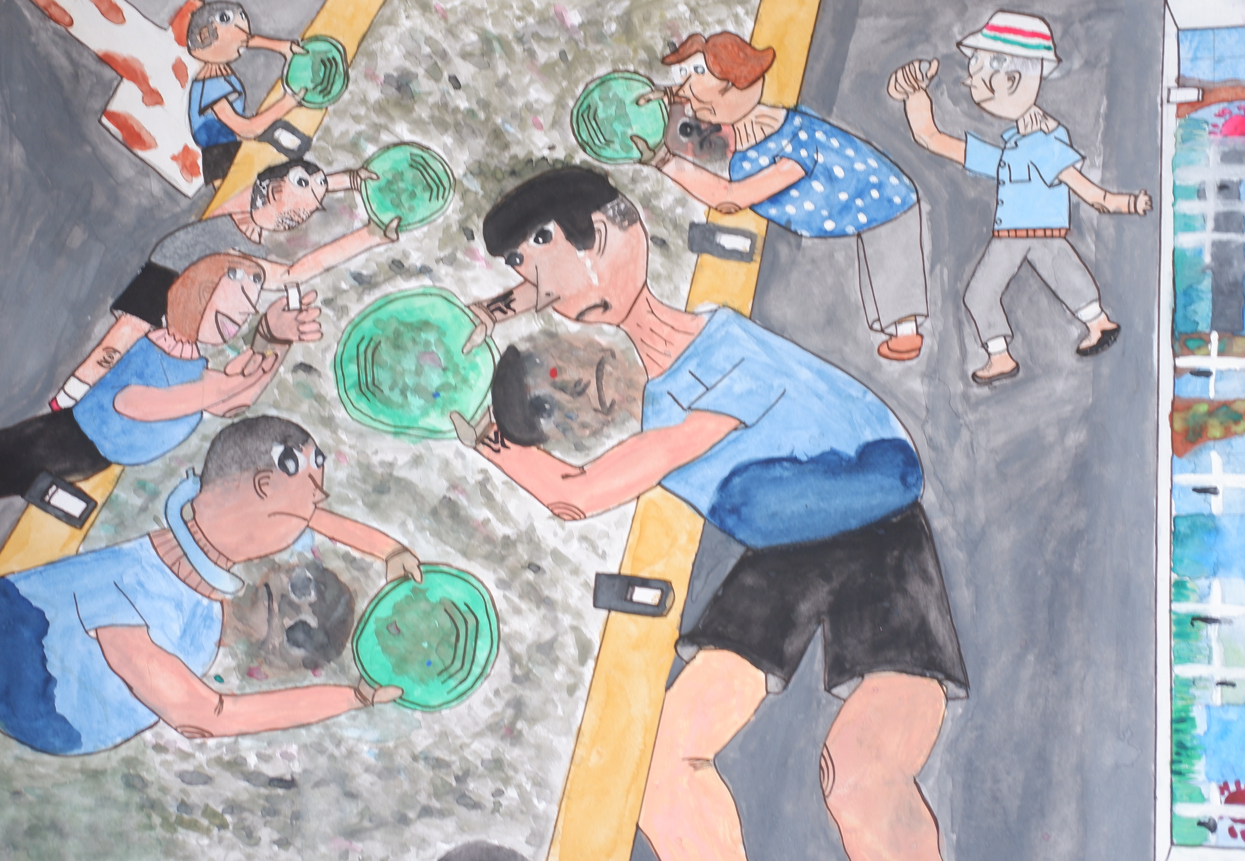 夢中(むちゅう)で取(と)り組(く)んだ体験(たいけん)を表現(ひょうげん)した作品(さくひん)で、見るものに訴(うった)えかける作品(さくひん)になっています。砂金(さきん)とりの説明(せつめい)をするサポーターの方がいて、そのもとで夢中(むちゅう)になって砂金(さきん)をとっている場面(ばめん)が見事(みごと)な表現力(ひょうげんりょく)で表(あらわ)されています。斜(ななめ)の構図(こうず)も大変(たいへん)工夫(くふう)されています。感動(かんどう)のある体験(たいけん)を絵に描(か)き留(と)めることをこれからも大事(だいじ)にしてほしいです。