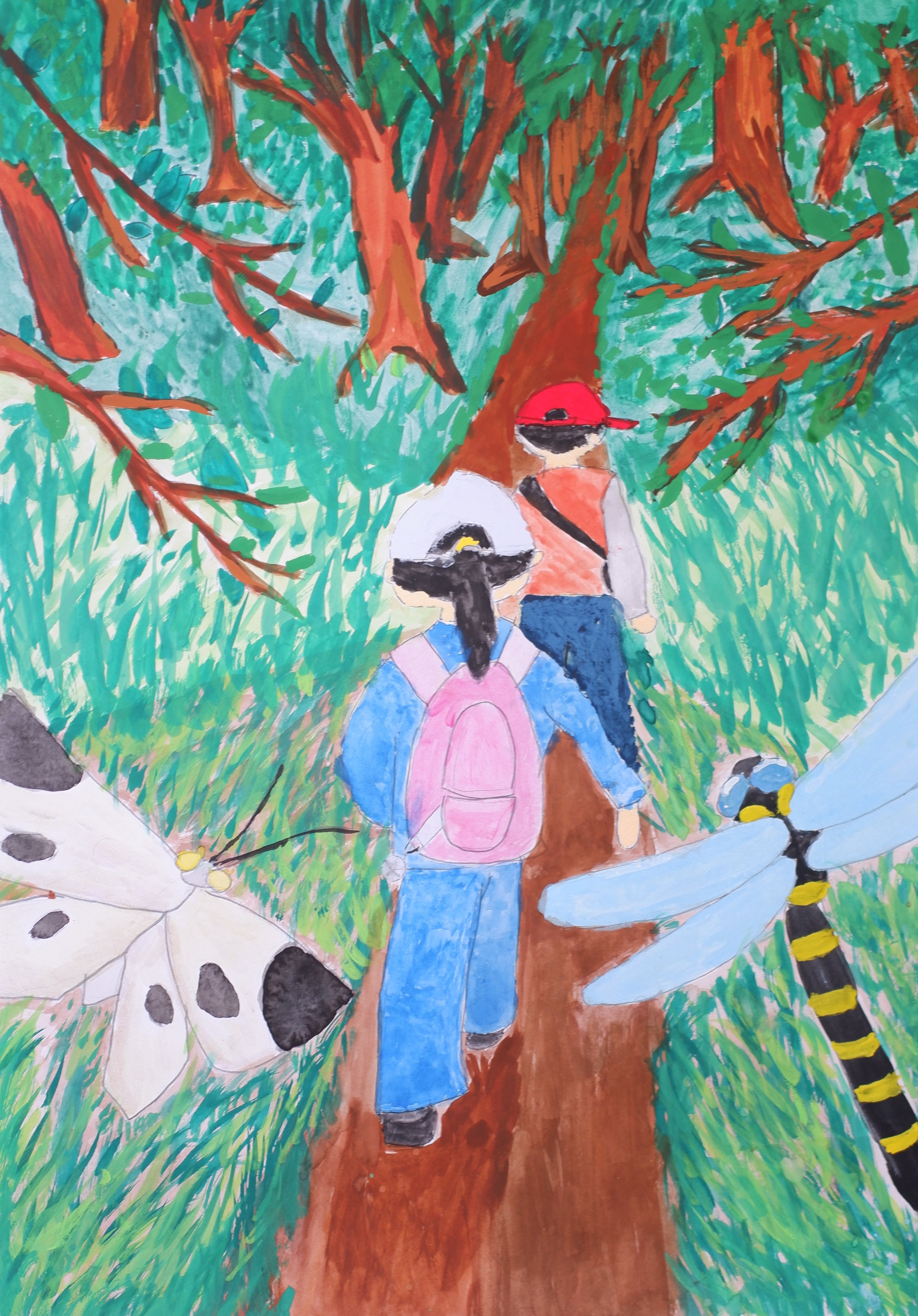 描写力(びょうしゃりょく)に優(すぐ)れ、非常に勢(いきお)いのある作品です。葉っぱや木を勢いよく塗(ぬ)り重(かさ)ねている作者(さくしゃ)の大胆(だいたん)さが感じられます。山の中に入っていく道の構図(こうず)が見事(みごと)に表現(ひょうげん)されていて、奥行(おくゆ)きが感じられます。人と蝶(ちょう)とトンボが山の中に入(はい)っていく、そこは緻密(ちみつ)に丁寧(ていねい)に描(えが)かれています。丁寧(ていねい)さと大胆(だいたん)さが織(お)り交(ま)ぜられた大変(たいへん)豊(ゆた)かな作品(さくひん)になっています。