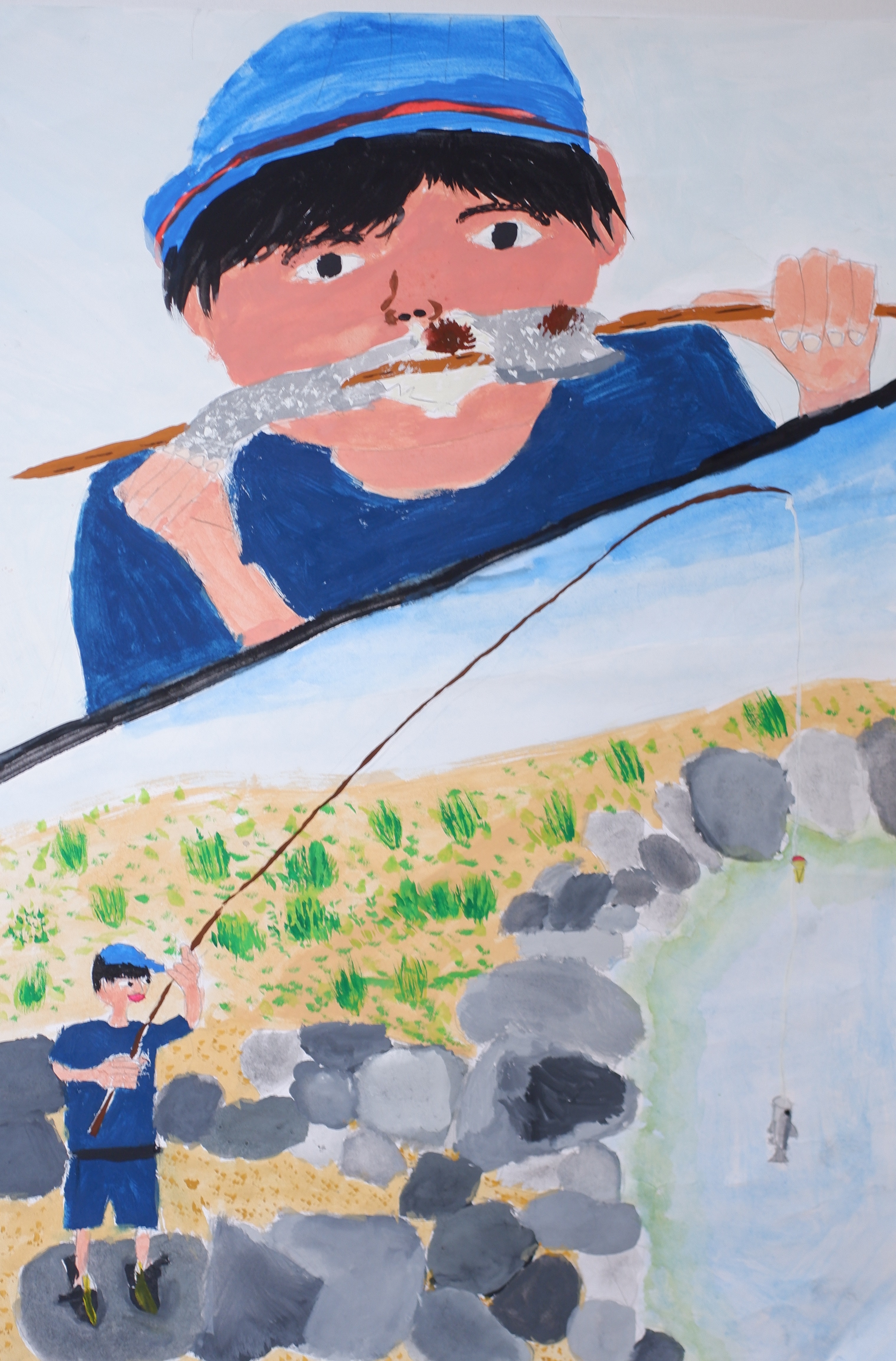 夏休みにお父さんと魚釣りに行ってきました。中々釣れず、本当に釣れるか不安でしたが、我慢強く待ってたら、やっと釣れました。釣れた時は、嬉しかったです。釣った魚をその場で焼いて食べました。その時の様子を絵に描きました。